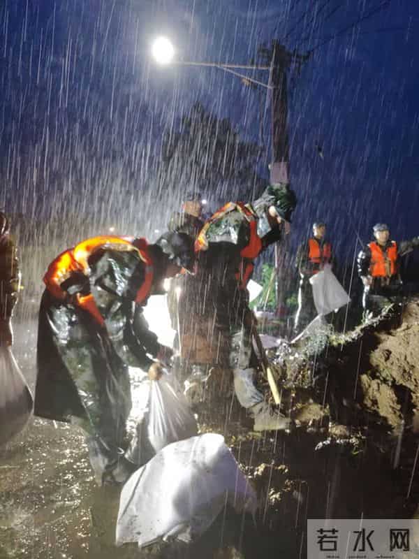 7月21日,驻扎在开封地区的空降兵某旅官兵冒雨在贾鲁河祥符区段加固堤坝(手机拍摄)。新华社发(李志伟 摄)