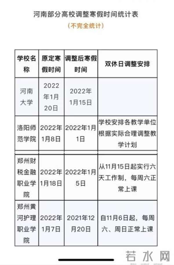 以河南为例,目前已有河南大学、河南农业大学、周口师范学院等20余所高校明确提前放假,多数学校的寒假开始时间较之前安排提前了5天至14天,郑州黄河护理职业学院更是直接将放假时前提前至12月20号。