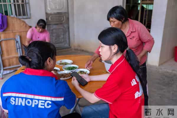 △图为融媒体资助宣传实践队成员在茶园走访时与张阿姨讲解资助政策的活动现场。