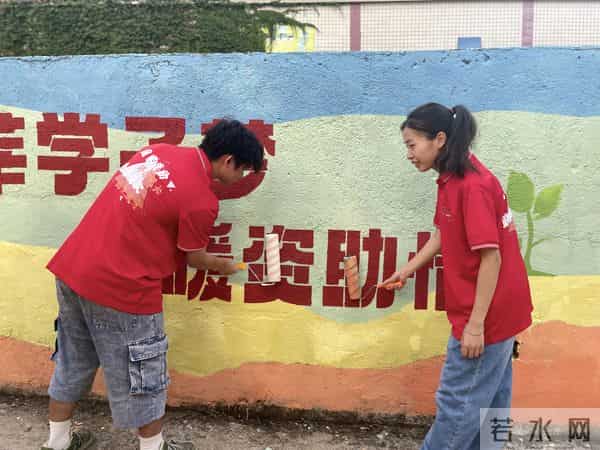 △图为融媒体资助宣传实践队队员绘制好资助墙绘后在给墙刷保护胶的活动现场。