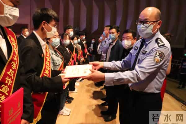 讲座结束后,与会领导嘉宾为我校34名大学生反诈宣传志愿者颁发聘书。