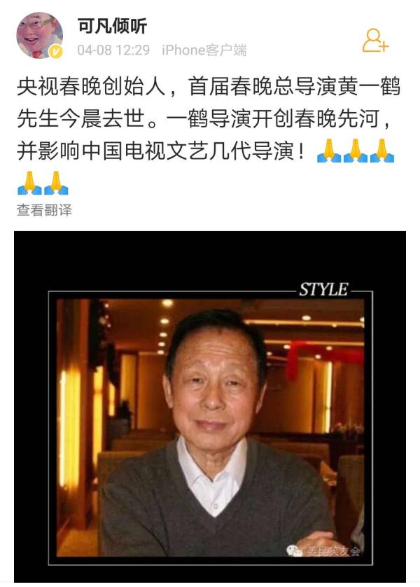 据主持人曹可凡微博透露,今天清晨,央视春晚开创者、首届春晚总导演黄一鹤先生去世,享年85岁。