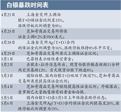 5月2日,国际白银价格忽然引爆下跌行情,当日跌幅达到8.19%;3日,白银跌幅达5.33%;6日,银价跌至34.66美元,一周累计跌幅高达30%。而在国内市场,5月第一周的跌幅超过25%。上海金交所白银T+D更是出现了罕见的连日封住跌停板的单边行情。
