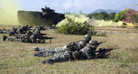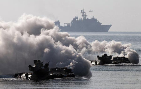“卡拉2009”演习中,在美军舰艇掩护下,进行两栖登陆的马来西亚陆战队。